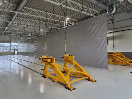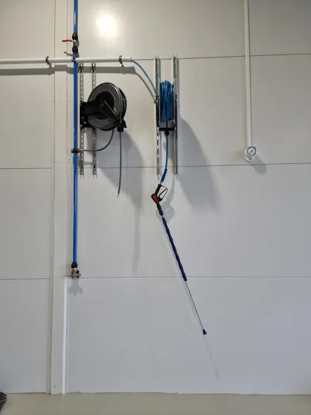 Motordrevne sprutgardiner for å avgrense sprut fra vask.